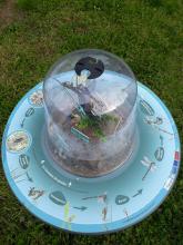 Pour ce faire, le plasticien Nicolas GAL a été mis à contribution pour concevoir un outil de découverte des libellules, sous la houlette des associations Les Ecologistes de l'Euzière et Demain la Terre! Il s'agit d'une représentation "sous cloche" d'un habitat de libellule, avec représentation des adultes et des larves aquatiques. Celle-ci est fixée sur une table qui explique le cycle de vie de ces insectes "amphibies".